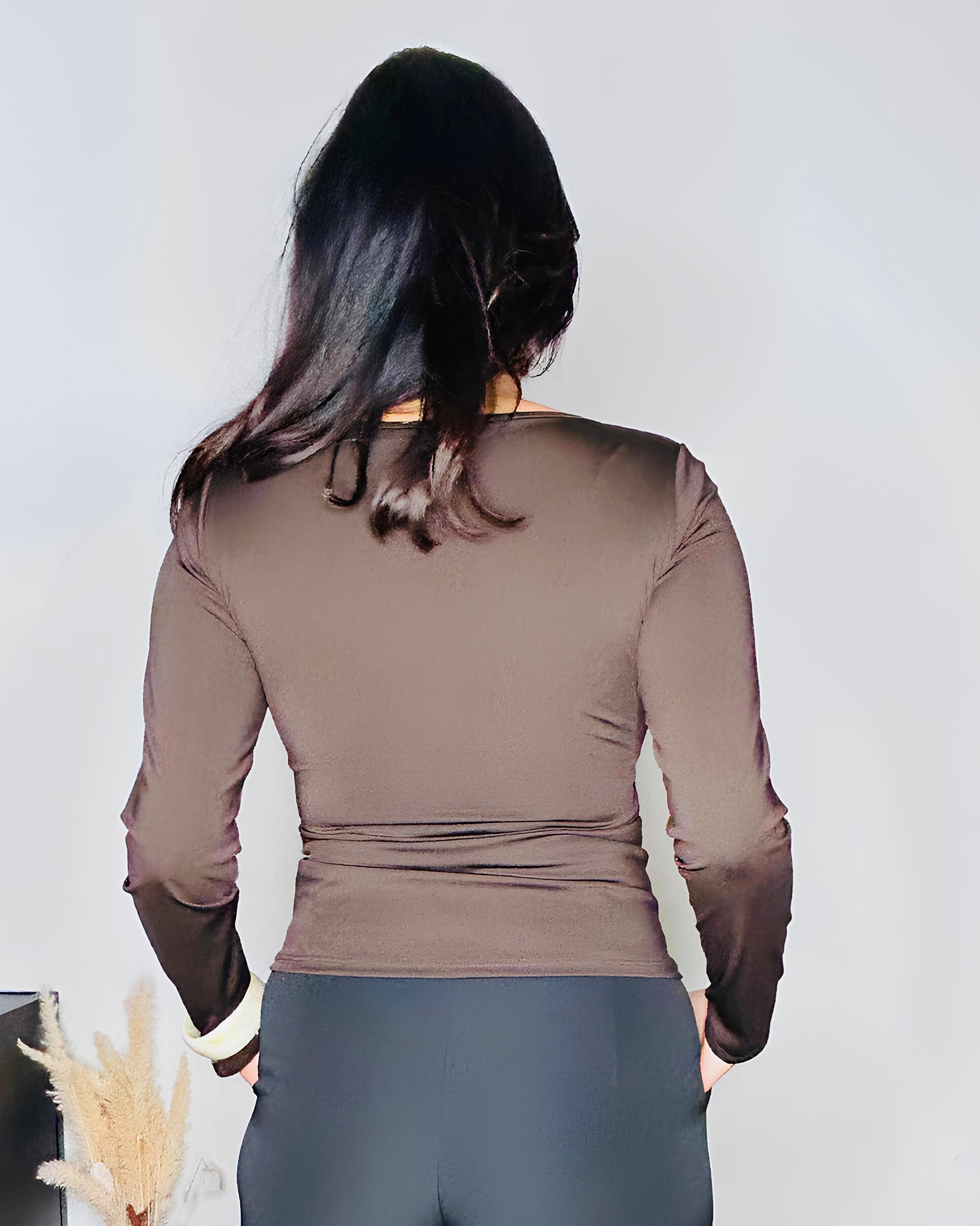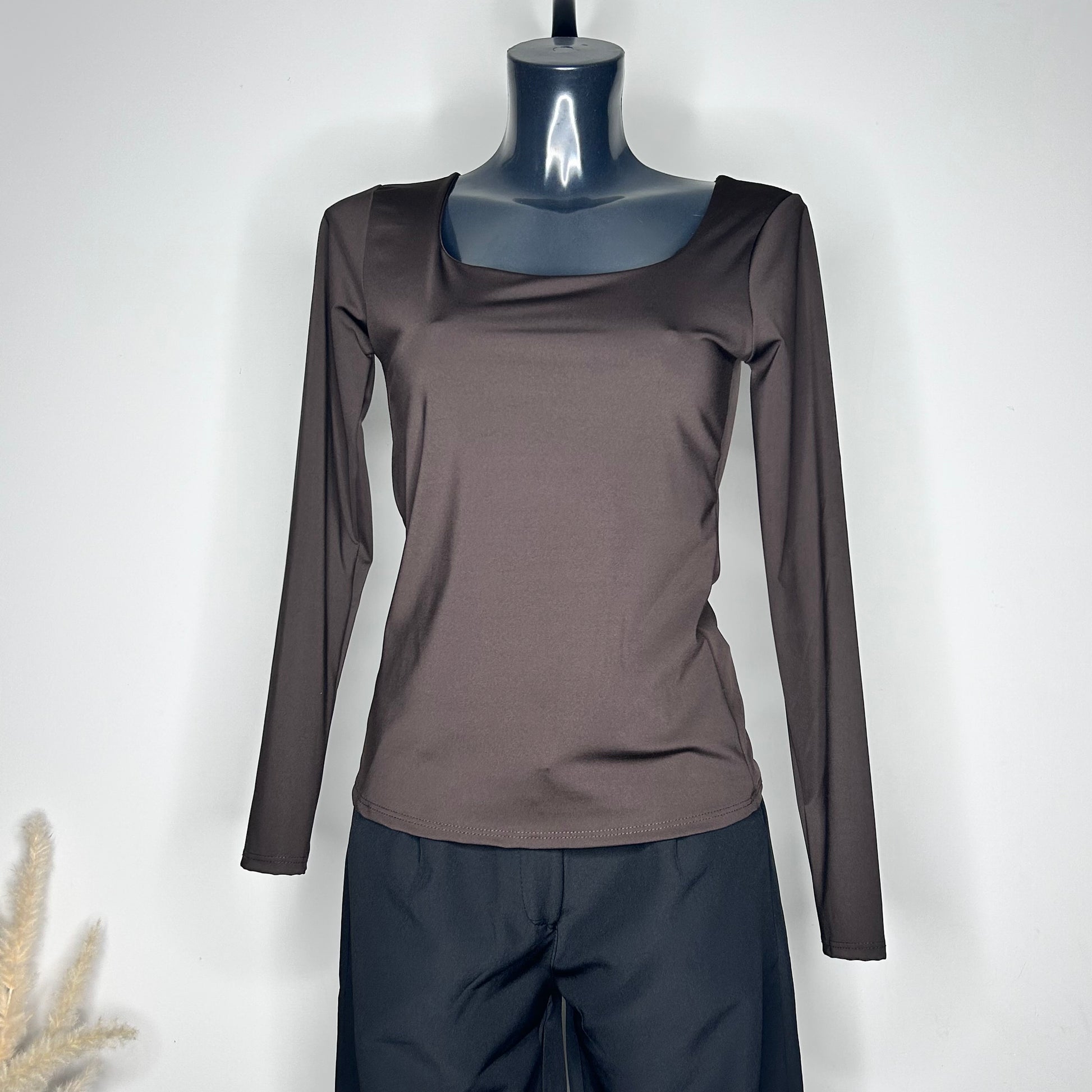 L'élégance réside dans la simplicité d'une coupe parfaite. Ce top ajusté marron glacé est une pièce fondamentale pour construire une garde-robe minimaliste et sophistiquée. Sa teinte profonde et chaude est une alternative douce au noir, idéale pour apporter de la dimension à vos tenues.