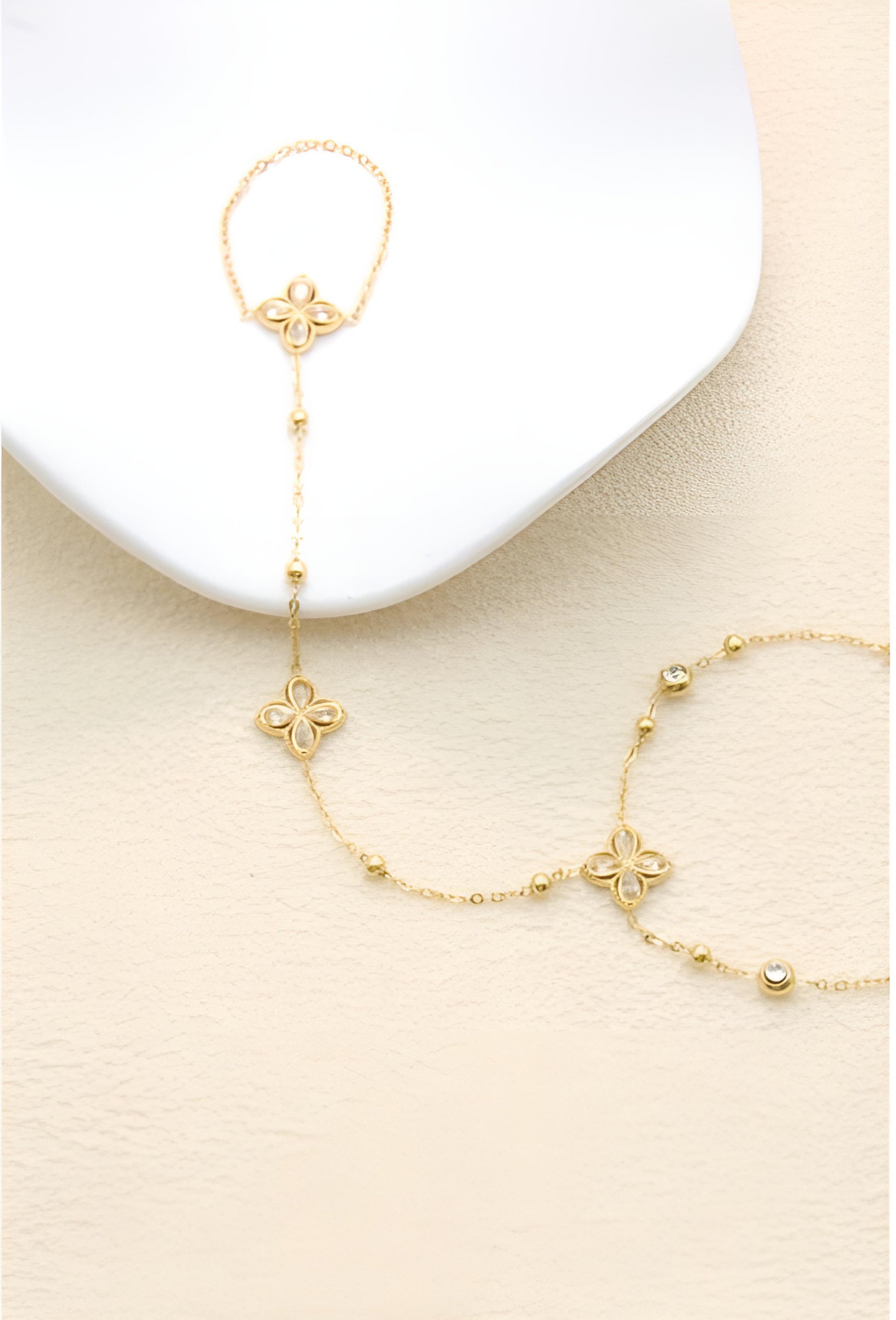 L'élégance se prolonge jusqu'au bout des doigts avec le bracelet-bague "Églantine". Ce bijou "main" d'une finesse rare habille votre dos de main d'une délicate chaîne dorée ponctuée de fleurs stylisées aux pétales de cristaux. Une pièce d'exception, à la fois bohème et sophistiquée, qui apporte une touche de magie à vos gestes.
