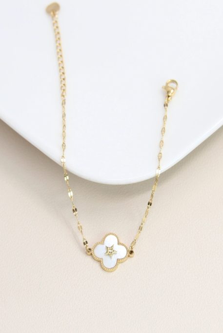 Bracelet trèfle orné d'étoile en acier inoxydable. Garantie sans nickel, sans cadmium, sans plomb. Résiste à l’eau et ne noircit pas.