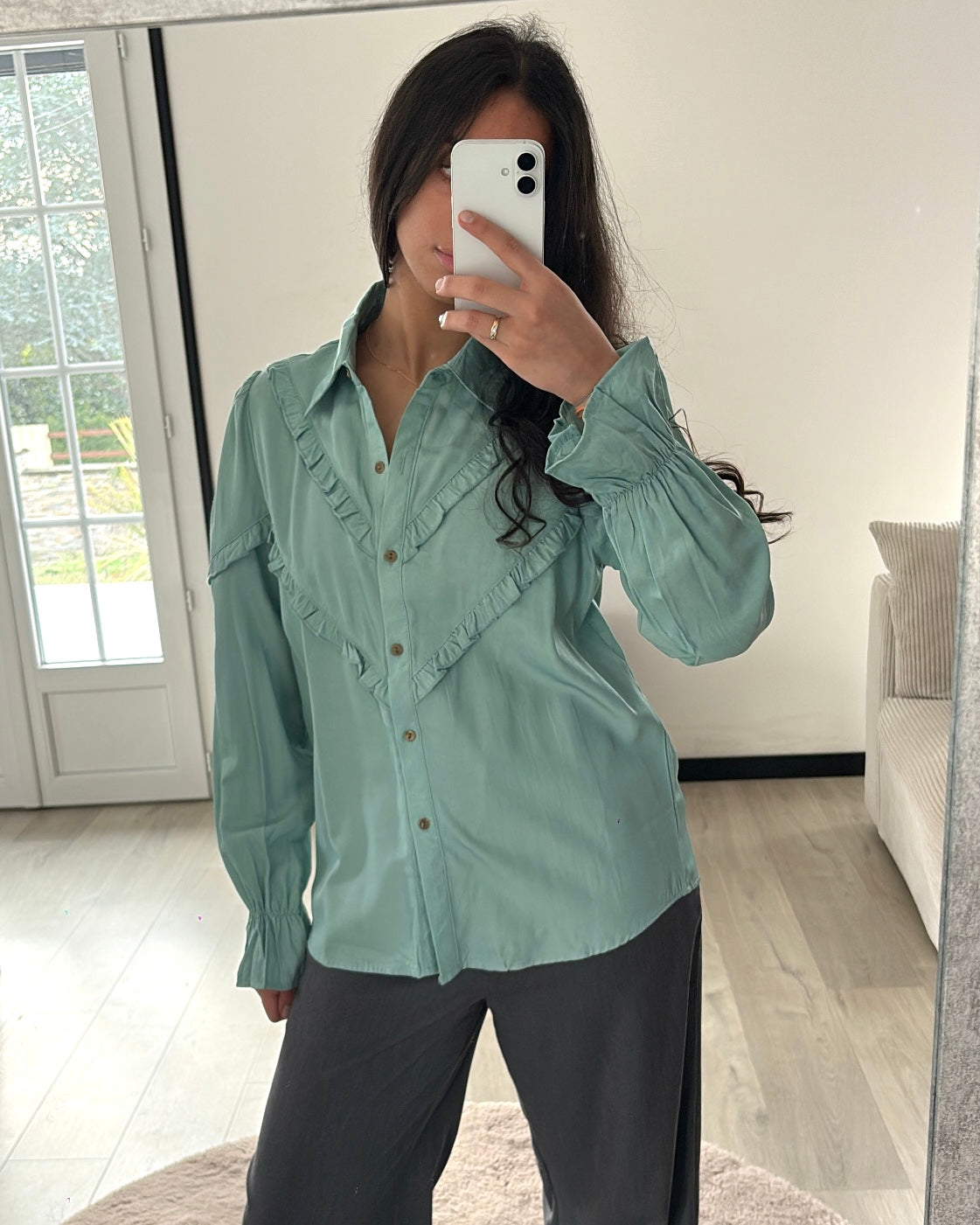 La douceur d'une couleur pastel alliée au charme du détail. Ce chemisier vert amande se distingue par ses volants délicats disposés en V sur le buste, apportant une touche romantique et structurée à votre tenue. Sa matière fluide et légère offre un confort absolu et un tombé élégant.