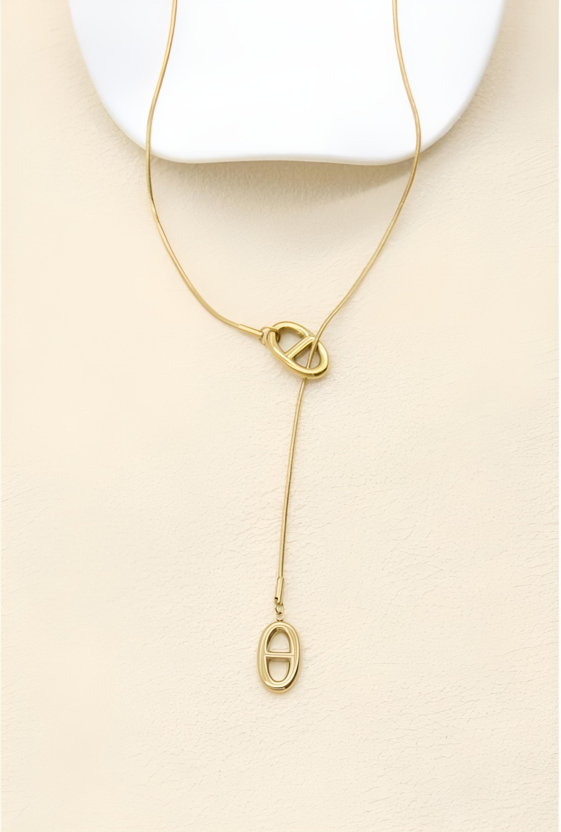 Le collier "Thalassa" incarne un minimalisme sophistiqué. Ce bijou au style "cravate" se distingue par son fermoir coulissant en forme de maille marine, qui permet de régler la hauteur du pendentif selon vos envies et votre décolleté. Sa chaîne serpent, fluide et soyeuse, se termine par un second maillon marine assorti, créant une ligne verticale élégante qui élance la silhouette.