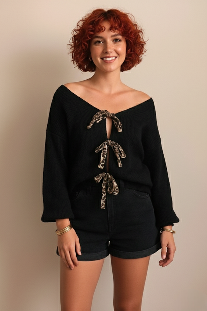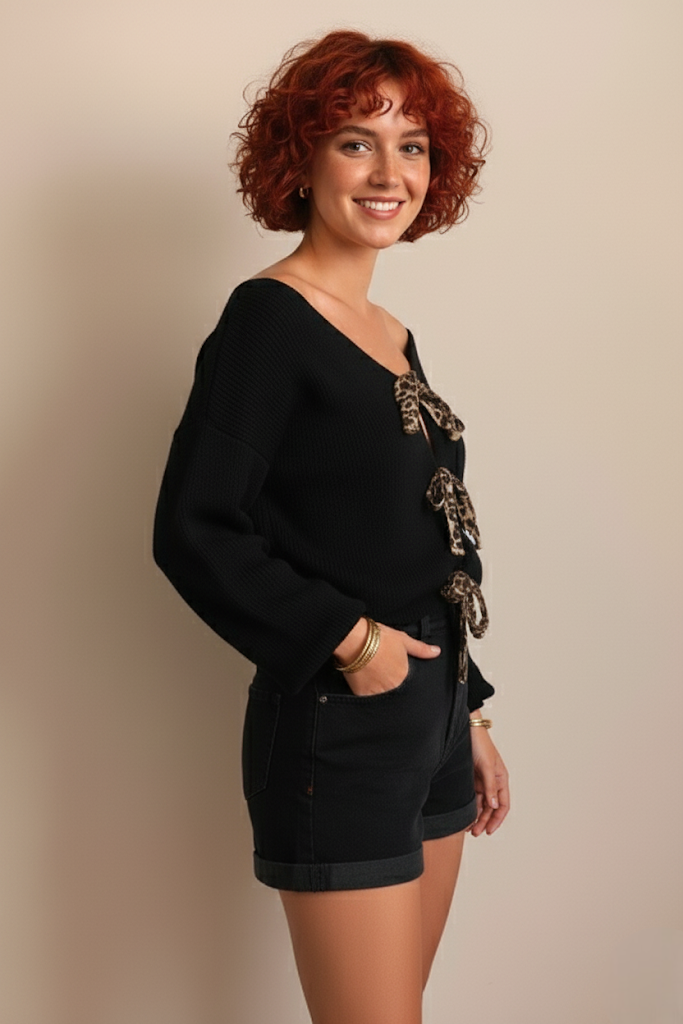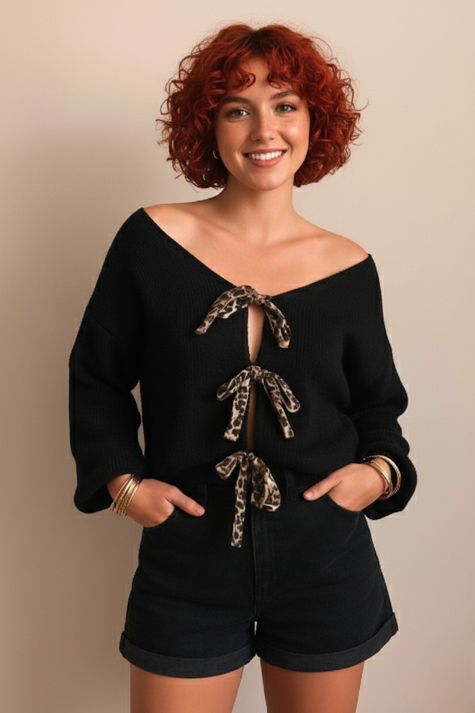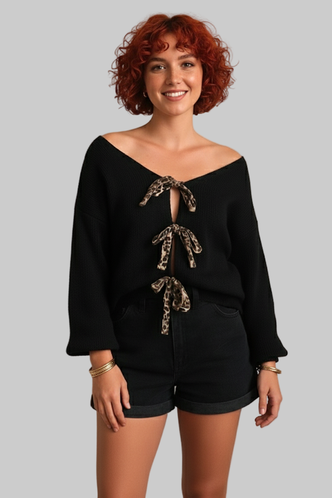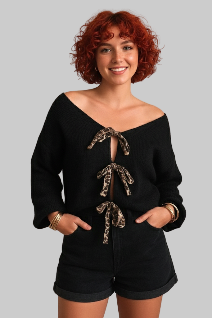 Apportez une touche audacieuse à votre garde-robe avec ce gilet élégant orné de noeuds léopard. Son motif vif attire le regard tandis que la coupe confortable assure un port facile en toute occasion. Parfait pour dynamiser une tenue simple, ce gilet conjugue style et originalité avec subtilité.