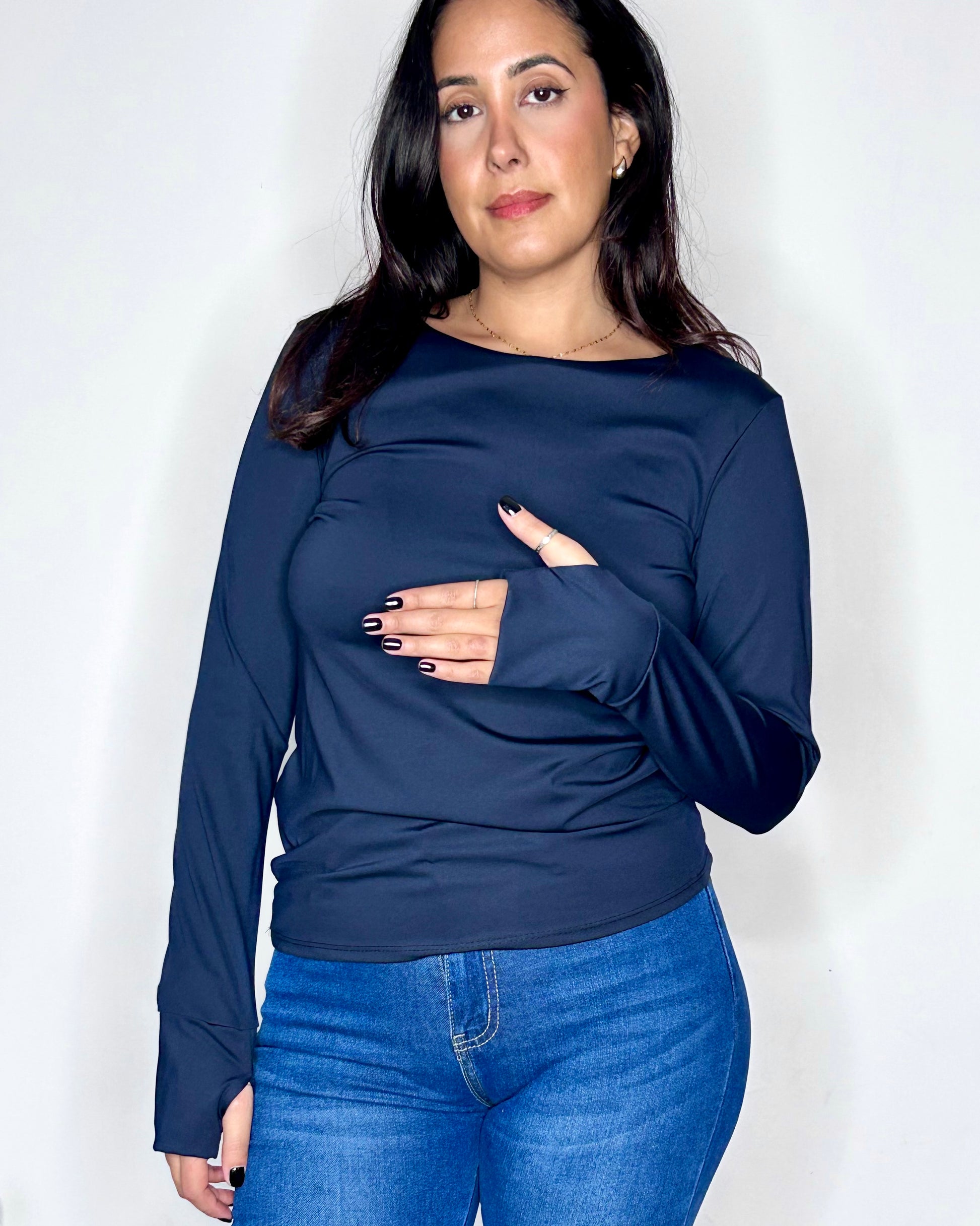 L'élégance minimaliste alliée à un détail de caractère. Ce top ajusté bleu marine est une pièce essentielle qui se distingue par la finesse de sa coupe et l'originalité de ses finitions. Sa teinte marine, profonde et intemporelle, offre une alternative raffinée au noir classique.