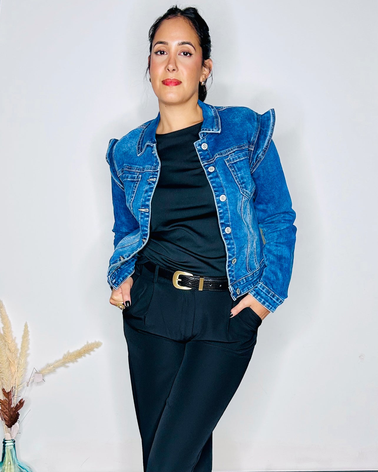 L'indispensable veste en jean revisitée avec une touche de féminité audacieuse. Cette veste en denim bleu moyen est la pièce parfaite pour apporter du relief et de l'originalité à vos tenues de saison. Elle se distingue par ses empiècements à volants structurés aux épaules, offrant une carrure moderne et une silhouette résolument "sportswear chic".